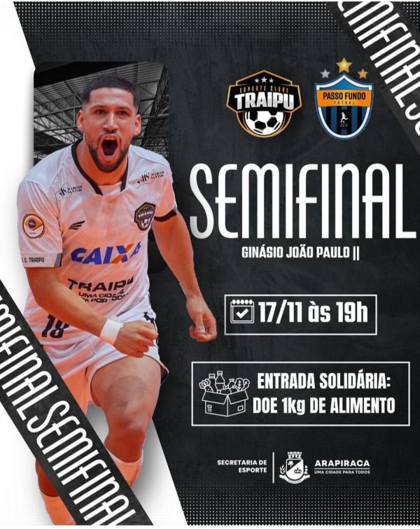 A entrada para este último jogo da semifinal entre Traipu e Passo Fundo é gratuita, mas o torcedor precisará levar 1 kg de alimento não perecível.